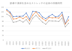 お互いに声を掛け合って準備する時間を短縮し、平行棒とプラットーホームを増やすことで理学療法士のストレッチなどの介入までの待機時間を短縮しました。